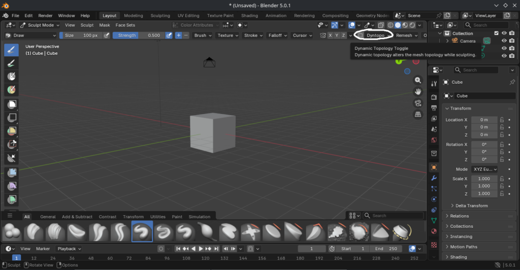 When I first started using Blender, I was using the edit mode to try to finagle the vertices into where I wanted them, which would, eventually, after DAYS of working, make a half-acceptable mesh. But in Blender there is a third mode called sculpting mode. I tried it, but it just made the geometry odd. THEN, when my mom started using Blender, she made some really amazing cat chess pieces (See her website for more on those!). I asked her how she made them, and she told me she was using the sculpting mode. I was astonished, and immediately looked up what I was doing wrong. Apparently, there’s this dynamic topology (Dyntopo) mode checkbox that is automatically turned off that allows you to actually add geometry instead of using the current geometry. Turning dyntopo off would be usable on higher geometry meshes, or when you want to edit something after vertex painting it, but otherwise you’d probably want to turn it on. I’ve included an image below with where you can find the checkbox.